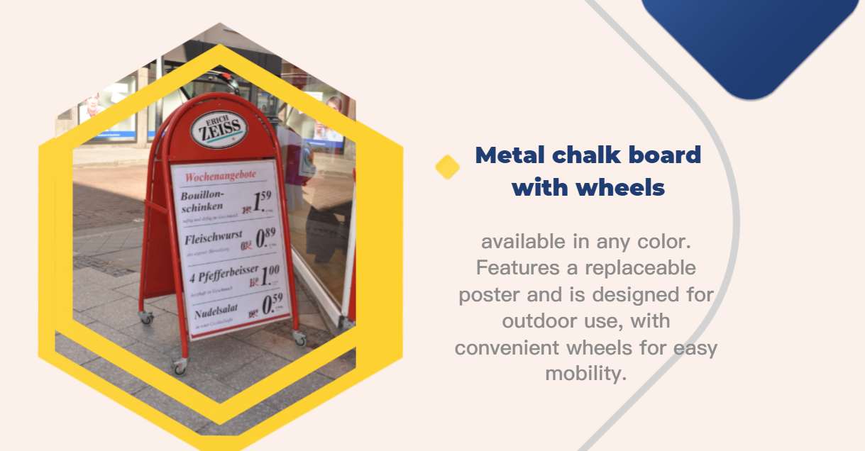 Portable: Thanks to the built-in wheels, this chalkboard can be easily moved between locations—ideal for temporary events, pop-up shops, or simply re-positioning in your store to attract more customers.