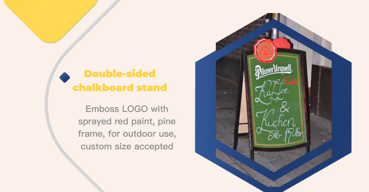 Customizable Sizes and Styles: We offer a range of sizes and styles to meet your specific needs. Whether you're looking for a compact chalkboard for a small shop or a larger one for outdoor events, we can customize the dimensions and design to fit your business perfectly.