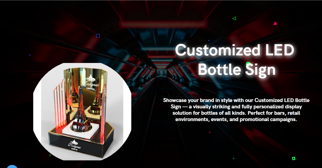 Elevate your brand visibility with our Custom LED Bottle Display — a fully tailored solution designed to enhance bottle presentation through vivid LED lighting and sleek, modern design. Perfect for promotional displays, retail environments, and bar settings.